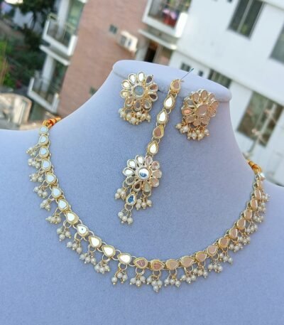 Short Description: Delicate gold-plated choker necklace featuring teardrop-shaped mirror pieces in peach/pastel tones, linked with gold frames and accented by clusters of dangling small white pearls. Includes matching floral mirror-work earrings with pearl drops and a coordinating maang tikka. A soft, bohemian-chic design perfect for bridal, festive, or ethnic fusion looks.