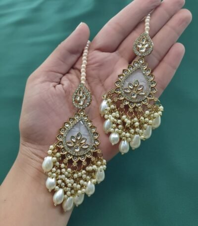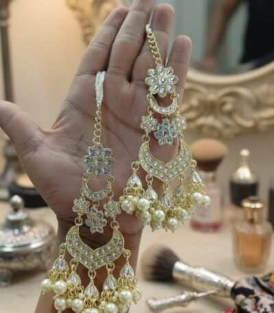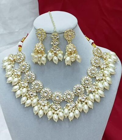 Short Description: Opulent gold-plated necklace set featuring intricate floral kundan/polki motifs surrounded by clusters of dangling white pearls for a cascading effect. Includes matching jhumka earrings with pearl drops and a delicate maang tikka. A rich, classic bridal design that exudes elegance—perfect for weddings, receptions, or grand traditional occasions.