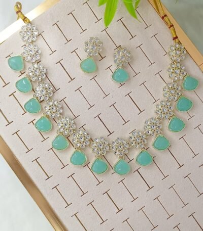 Login to see pricesTitle: Mint Green Kundan Necklace Set with Floral Drops