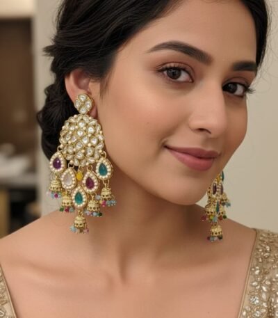 Login to see pricesএই রাজকীয় নেকলেস সেটটি গোল্ড টোনের তৈরি, যাতে বড় বড় রুবি (লাল স্টোন) এবং সবুজ এমেরাল্ড স্টোনের সাথে ঝকঝকে হোয়াইট স্টোন সেট করা। নেকলেসের ডিজাইনে ছোট ছোট গোল্ডেন বল এবং রিংয়ের প্যাটার্ন যোগ করা হয়েছে, যা ঐতিহ্যবাহী ভারতীয় স্টাইলের একটি অসাধারণ উদাহরণ। ম্যাচিং ইয়াররিংস সহ এই সেটটি সাড়ি বা এথনিক পোশাকের সাথে পরলে রয়্যাল লুক দেবে। বিবাহ, রিসেপশন বা বিশেষ উৎসবে পরার জন্য আদর্শ – টেকসই এবং চকচকে, উপহার হিসেবেও দারুণ!