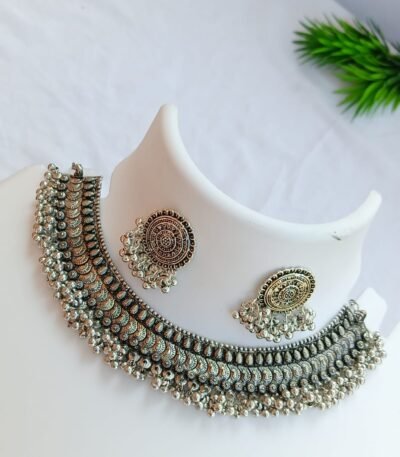 Login to see pricesTitle: Oxidized Silver Ghungroo Choker Necklace Set with Jhumka Earrings