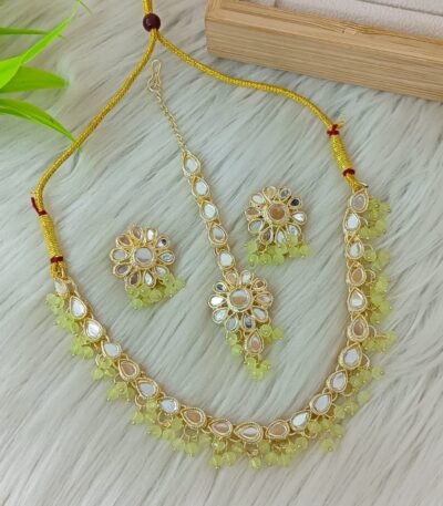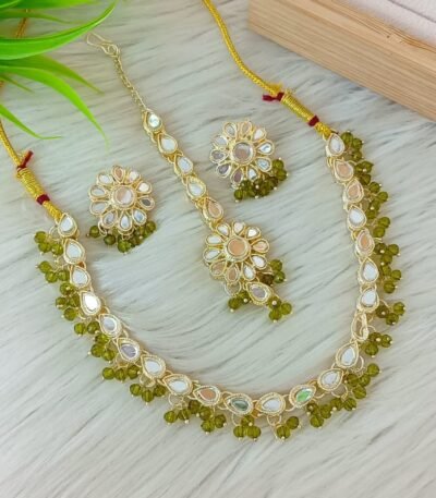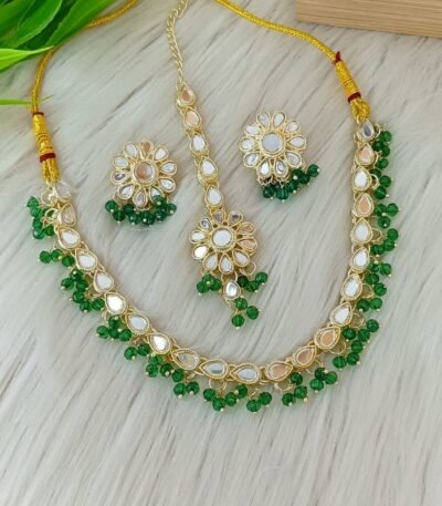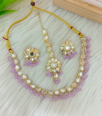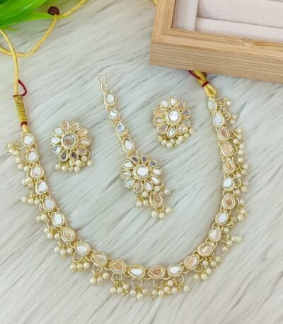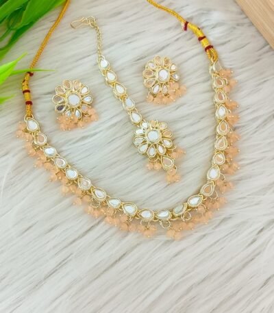 ndian-style antique Kundan jewellery set includes a necklace, earrings, and a maang tikka,