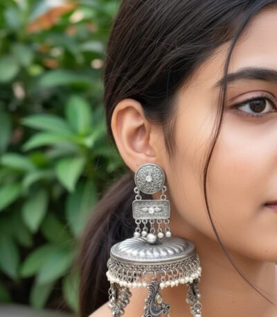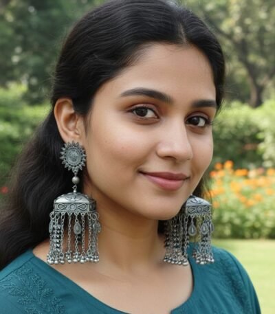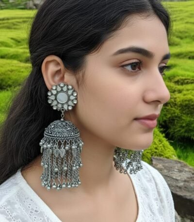 Short Description: Statement oxidized silver-tone long jhumka earrings featuring a floral mirror-work (sheesha) stud top with clear stone accents, connected to an intricately engraved dome and cascading chains adorned with tiny ghungroo bells and leaf charms. A dramatic bohemian-ethnic design that adds vintage charm—perfect for traditional outfits, fusion wear, festivals, or everyday bold styling.