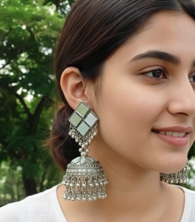 Login to see pricesTitle: Oxidized Silver Mirror-Work Long Jhumka Earrings