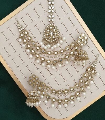 Short Description: Elegant gold-tone pendant necklace featuring a large central lotus flower motif with vibrant pink and green meenakari (enamel) work, framed in intricate filigree, and accented with dangling white pearl drops. The chain has a unique arrowhead link design. Paired with matching small lotus stud earrings in pink meenakari. A delicate, traditional design symbolizing beauty and purity—perfect for ethnic wear, festivals, or everyday elegance.