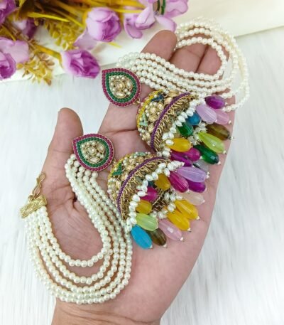Login to see pricesTitle: Multicolor Jhumka Earrings with Pearl Sahara (Ear Chains)