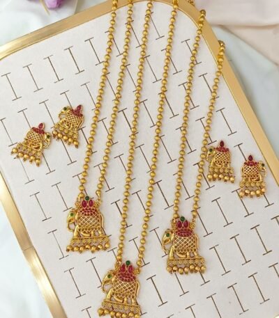 Login to see pricesShort Description: Make a bold statement with this breathtaking Temple-style jewelry set. The necklace features intricately crafted gold-plated elephant motifs, symbolizing royalty and grace. It is beautifully accented with ruby red and emerald green stones, finished with a lush fringe of delicate pearl clusters for a classic Guttapusalu look.