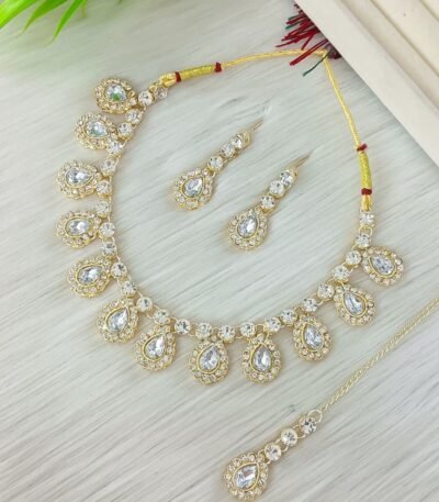 Teardrop Zircon Polki Necklace Set with Maang Tikka