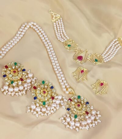 Short Description: Statement oversized jhumka earrings featuring teardrop tops with ruby red and emerald green accents, intricate gold filigree, and vibrant multicolored dangling beads (pink, purple, yellow, green, blue). Paired with multi-strand white pearl ear chains (sahara) for added drama. A bold, festive design perfect for bridal looks, weddings, receptions, or traditional celebrations.