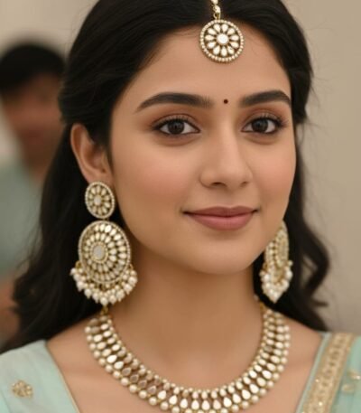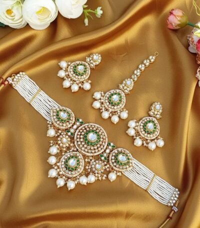 Login to see pricestraditional Indian jewelry set features a gold-plated kundan and pearl choker, matching earrings, and a maang tikka, similar to styles found from vendors like Distacart and Avenlee.