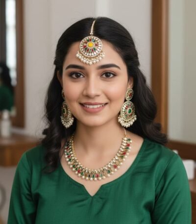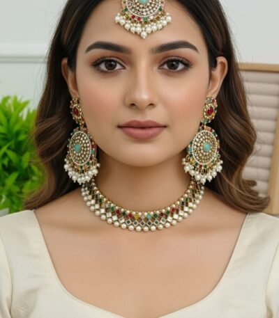 - A multi-colored choker necklace, often featuring materials like brass, kundan, and stones.