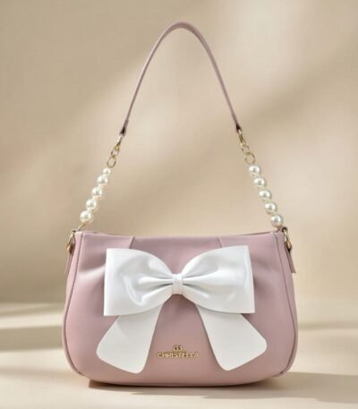 This beautiful shoulder bag from Chrisbella features a soft pastel pink faux leather body with a smooth, gently structured design and subtle quilting for added elegance. The centerpiece is a large, glossy white satin bow placed prominently on the front, creating a sweet, romantic, and ultra-feminine focal point. It includes a long adjustable shoulder strap adorned with shiny white faux pearls and gold chain links for a luxurious, glamorous touch, finished with gold hardware accents and the brand “CHRISTELLA” embossed in gold at the bottom.