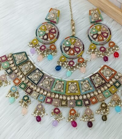 Login to see pricesTitle: Vibrant Multicolor Navratna Bridal Choker Set with Maang Tikka