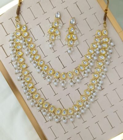 Short Description: Elegant gold-plated choker necklace adorned with teardrop-shaped white kundan/polki stones and clusters of dangling small white pearls. Comes with matching delicate drop earrings featuring pearl accents. A timeless and sophisticated design, ideal for bridal, wedding guest, or traditional ethnic looks.
