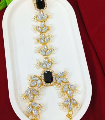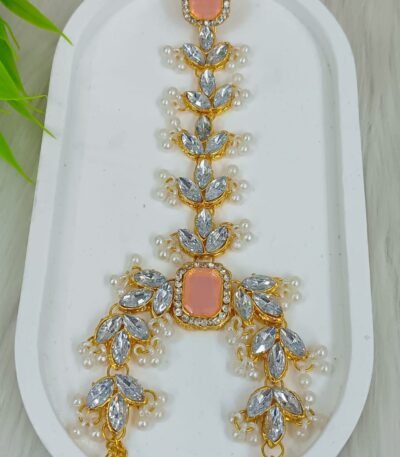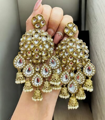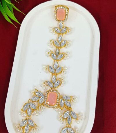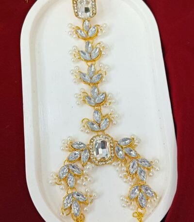 Short Description: Luxurious gold-plated choker necklace featuring intricate floral and paisley kundan/polki motifs with clear stones, richly layered with dense clusters of white pearl drops for a dramatic cascading effect. Includes matching oversized chandbali-style earrings with pearl fringes and a delicate maang tikka. A timeless, opulent bridal design perfect for weddings, receptions, or grand traditional ethnic occasions.