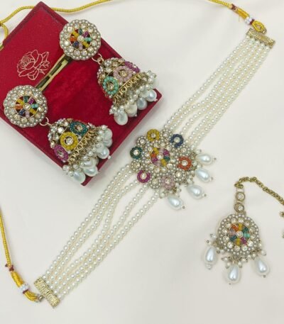 Login to see pricesTitle: White Pearl & Kundan Polki Multi-Pendant Choker Set