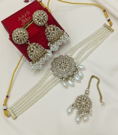 Login to see pricesTitle: White Kundan Polki Pearl Choker Necklace Set