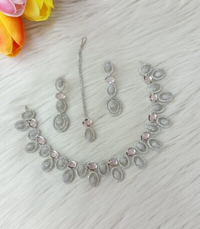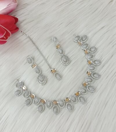 Short Description: Elegant gold-plated choker necklace featuring interconnected floral and geometric kundan/polki motifs with clear stones, accented by dangling small white pearl drops for a soft cascading effect. Includes matching delicate drop earrings and a small maang tikka with pearl details. A refined and graceful design, ideal for bridal wear, weddings, receptions, or traditional ethnic occasions.