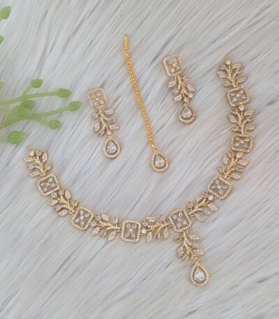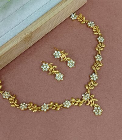 Short Description: Delicate gold-plated necklace featuring a vine-like design with alternating floral clusters of sparkling clear zircon/American diamonds (AD) and gold leaf motifs, ending in a Y-drop pendant with a flower detail. Paired with matching small floral drop earrings. A graceful, nature-inspired design that offers a light and elegant look—perfect for parties, receptions, or modern ethnic wear.