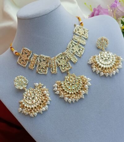 Short Description: Elegant gold-plated choker necklace featuring interconnected rectangular and square kundan/polki motifs with clear stones and pearl bead accents. Includes oversized crescent-shaped chandbali earrings with dense pearl cluster drops and a matching pendant-style piece. A sophisticated and opulent design, perfect for bridal wear, weddings, receptions, or traditional ethnic occasions.
