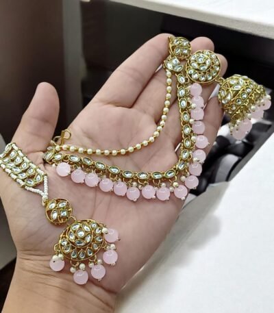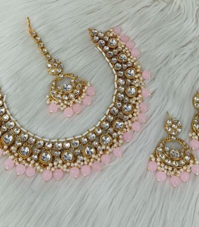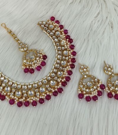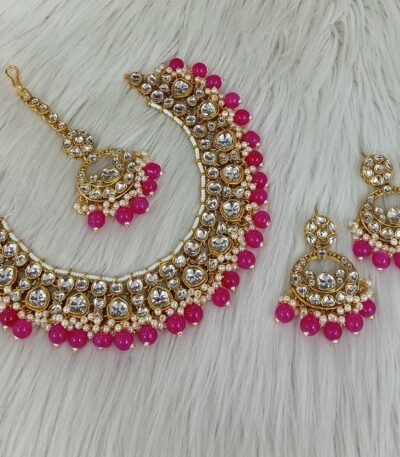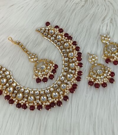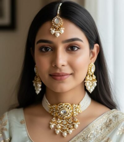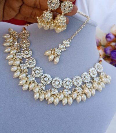 Login to see pricesTitle: Floral Kundan Polki Pearl Choker Set with Jhumka Earrings & Maang Tikka