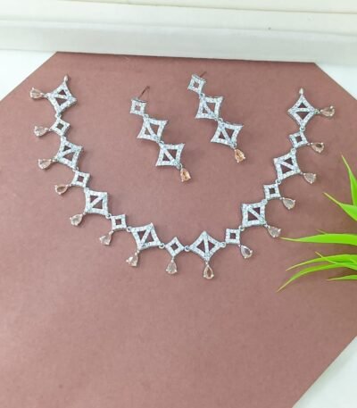 Short Description: Elegant silver-tone necklace featuring interconnected diamond-shaped links encrusted with sparkling clear zircon/American diamonds (AD). Each link has a dangling soft pink quartz or rose quartz teardrop for a subtle pop of color. Includes matching geometric drop earrings with pink quartz accents. A modern, glamorous design perfect for parties, receptions, or contemporary ethnic looks.