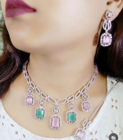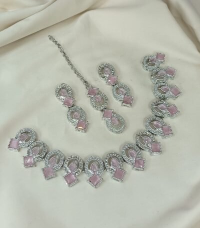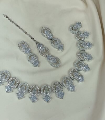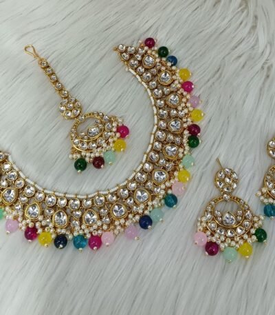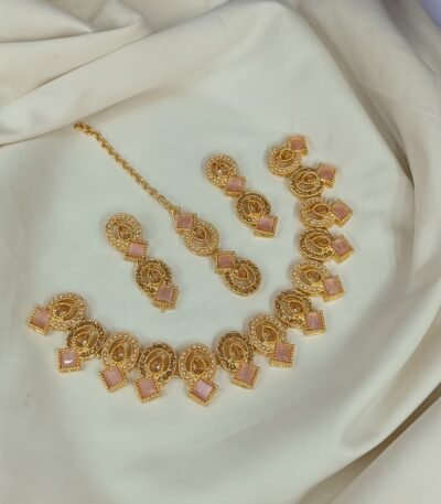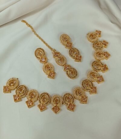 gold-plated necklace set, which includes a necklace, earrings, and a maang tikka, is a traditional design often associated with South Asian bridal or festive wear.