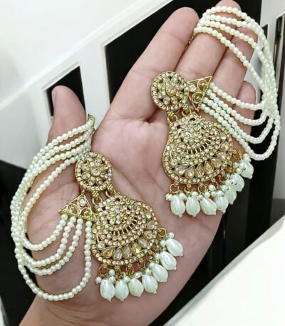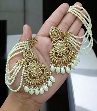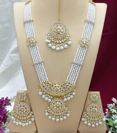 Short Description: Opulent gold-plated bridal jewelry set featuring a statement necklace with large circular kundan/polki motifs and dangling pearl drops. Includes oversized crescent-shaped chandbali earrings, a matching maang tikka, and a delicate headpiece chain—all richly embellished with white kundan stones and pearls. A luxurious and traditional choice for weddings, receptions, or special ethnic occasions.