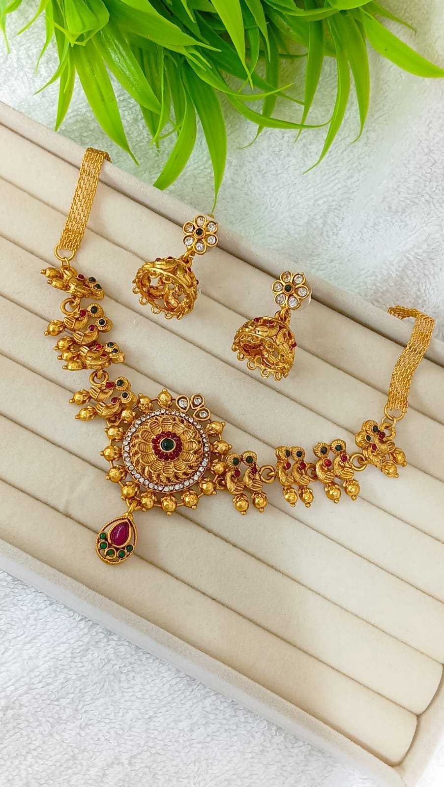 ঐতিহ্যবাহী আভিজাত্য এবং আধুনিক কারুকাজের এক অপূর্ব নিদর্শন এই অ্যান্টিক গোল্ড-প্লেটেড চকার সেট। এর নিখুঁত ময়ূর (Peacock) মোটিফ এবং লাল-সবুজ পাথরের ছোঁয়া আপনাকে দেবে একটি রাজকীয় লুক। যেকোনো গর্জিয়াস শাড়ি বা লেহেঙ্গার সাথে উৎসবের সাজে পূর্ণতা আনতে এই সেটটি অনন্য।