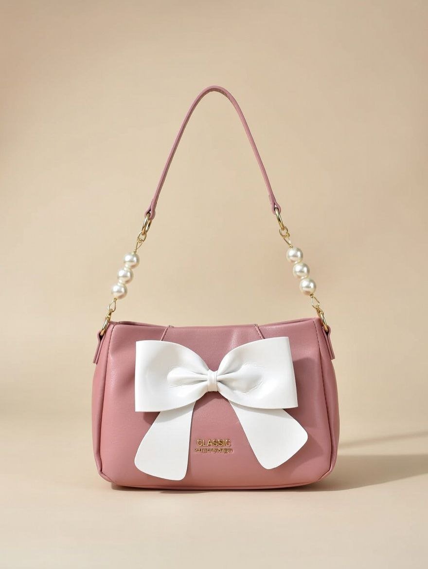 This elegant shoulder bag from Classic features a soft pastel pink faux leather body with a smooth, glossy finish and gentle curved shaping for a feminine silhouette. The standout detail is the large, luxurious white satin bow centered on the front, adding a sweet, romantic, and ultra-chic accent. It comes with a long adjustable shoulder strap beautifully adorned with shiny white faux pearls and gold chain links for a glamorous, high-end touch, completed with gold hardware accents and the brand “CLASSIC” embossed in gold at the bottom.