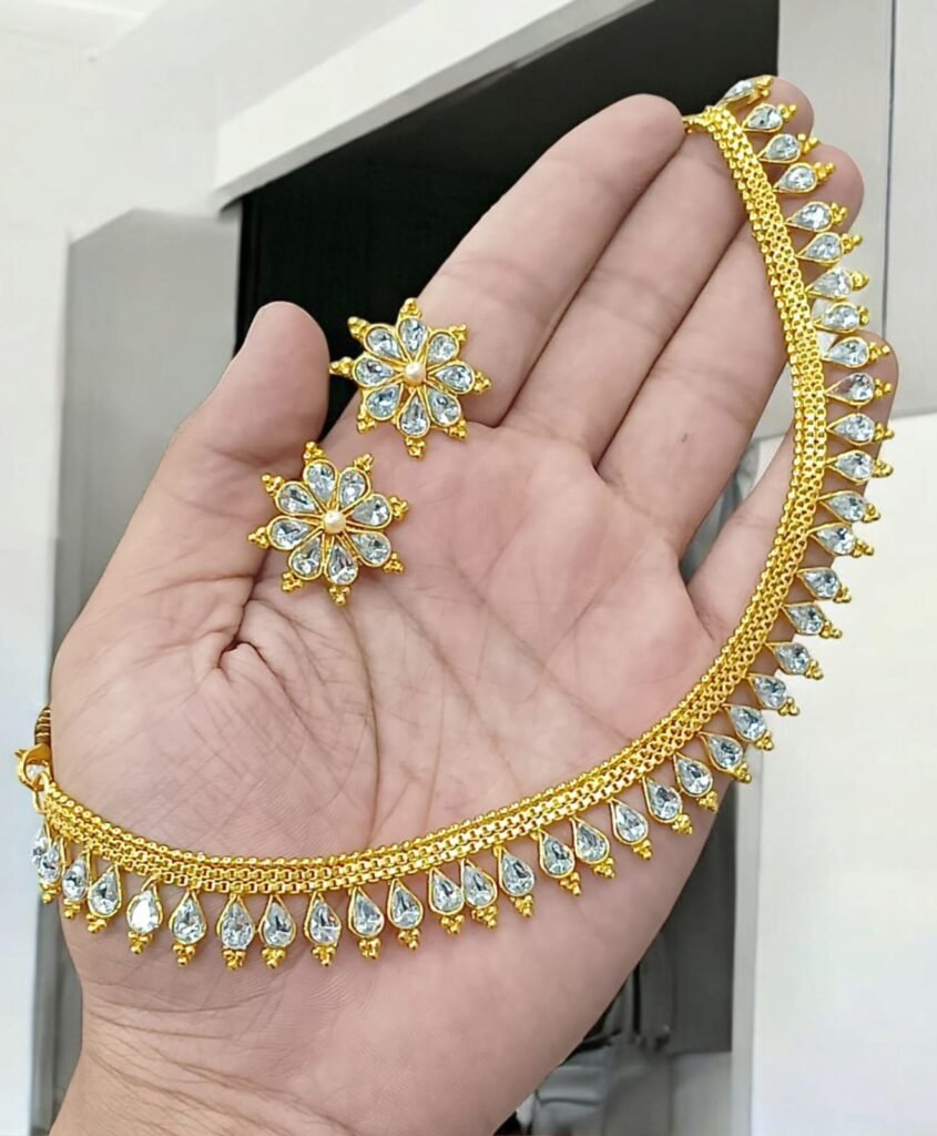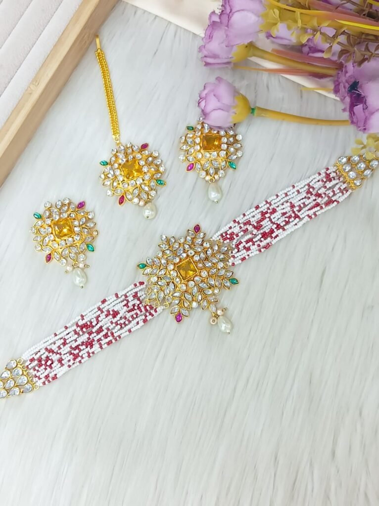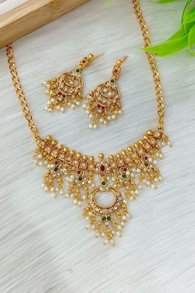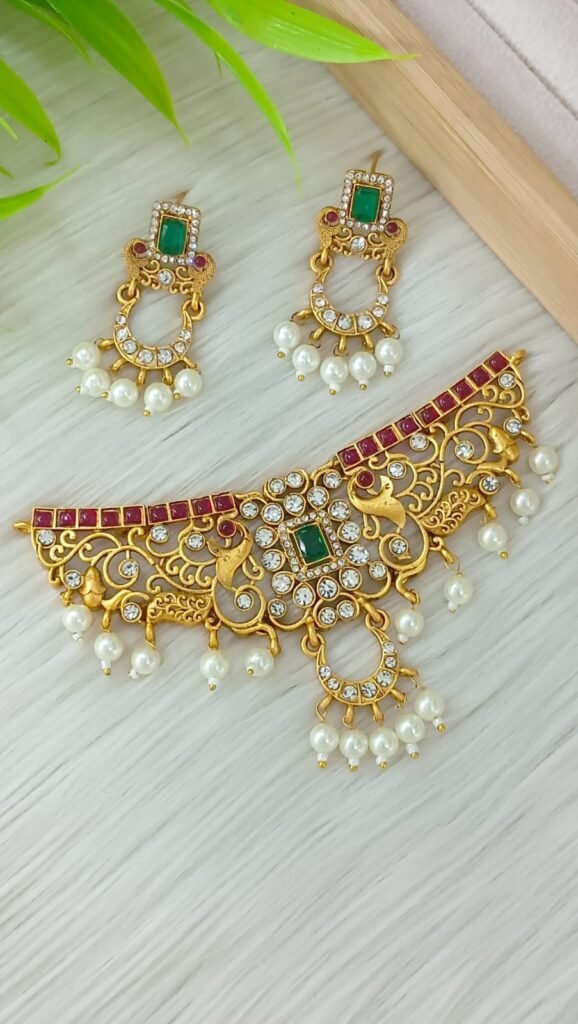 Design: Traditional choker style necklace with intricate golden geometric patterns.