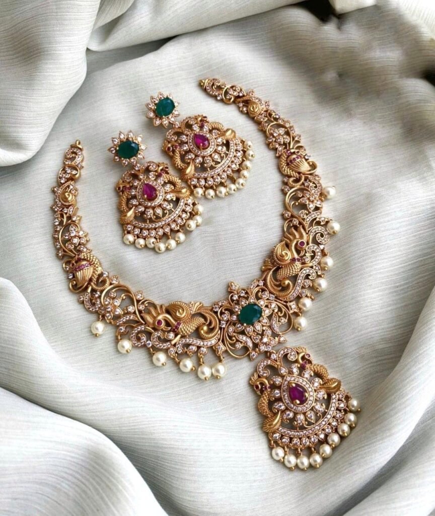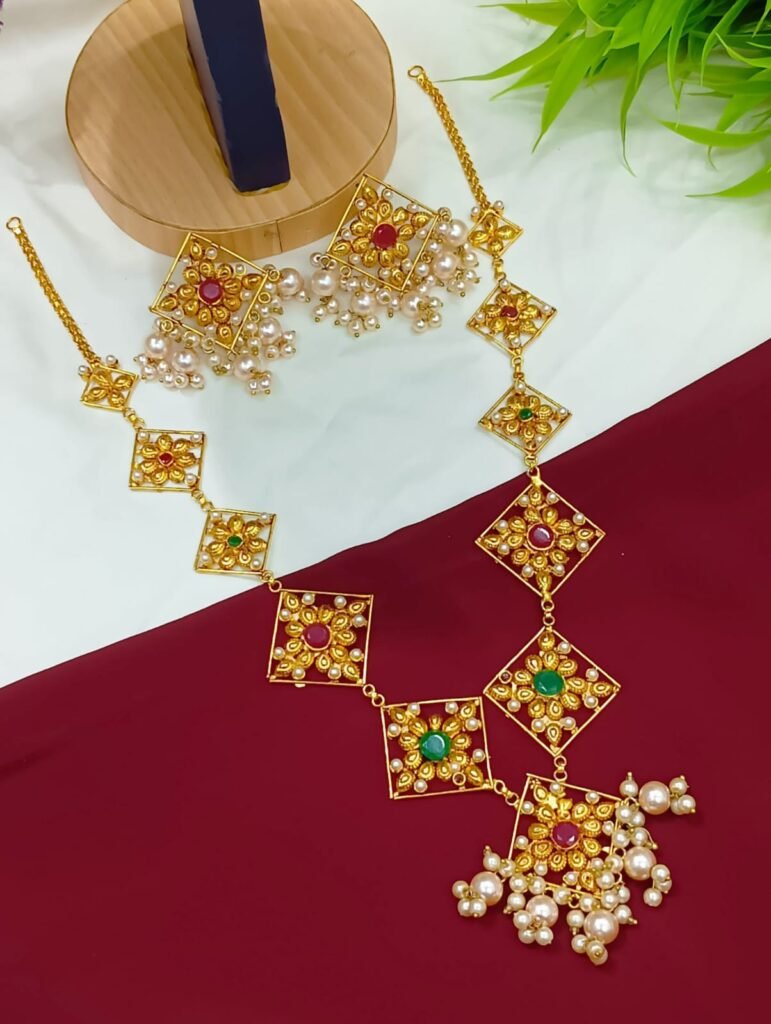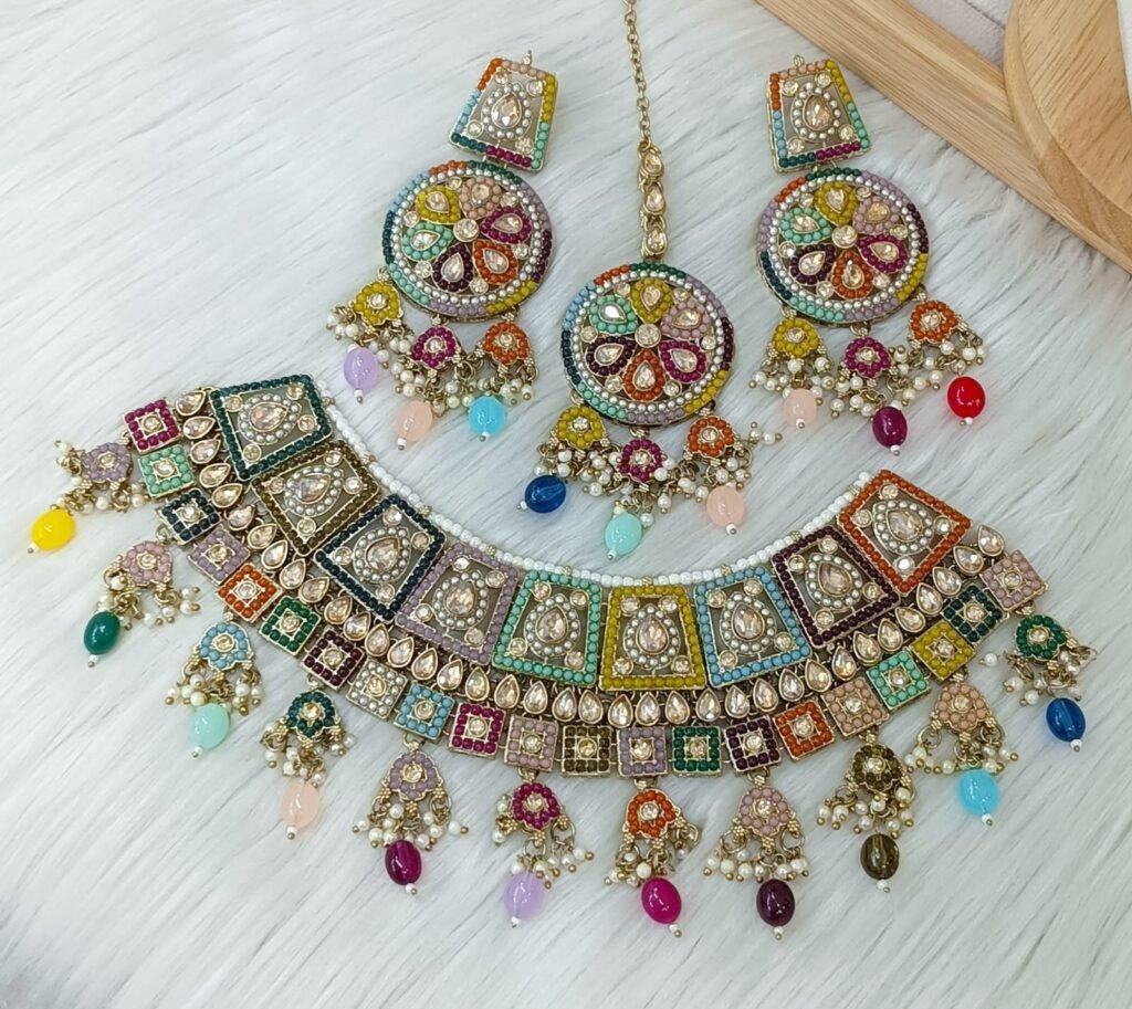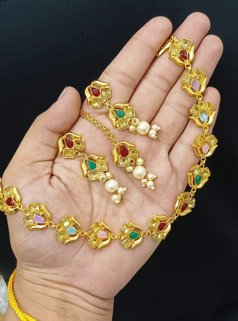 Design: Traditional choker style necklace with intricate golden geometric patterns.