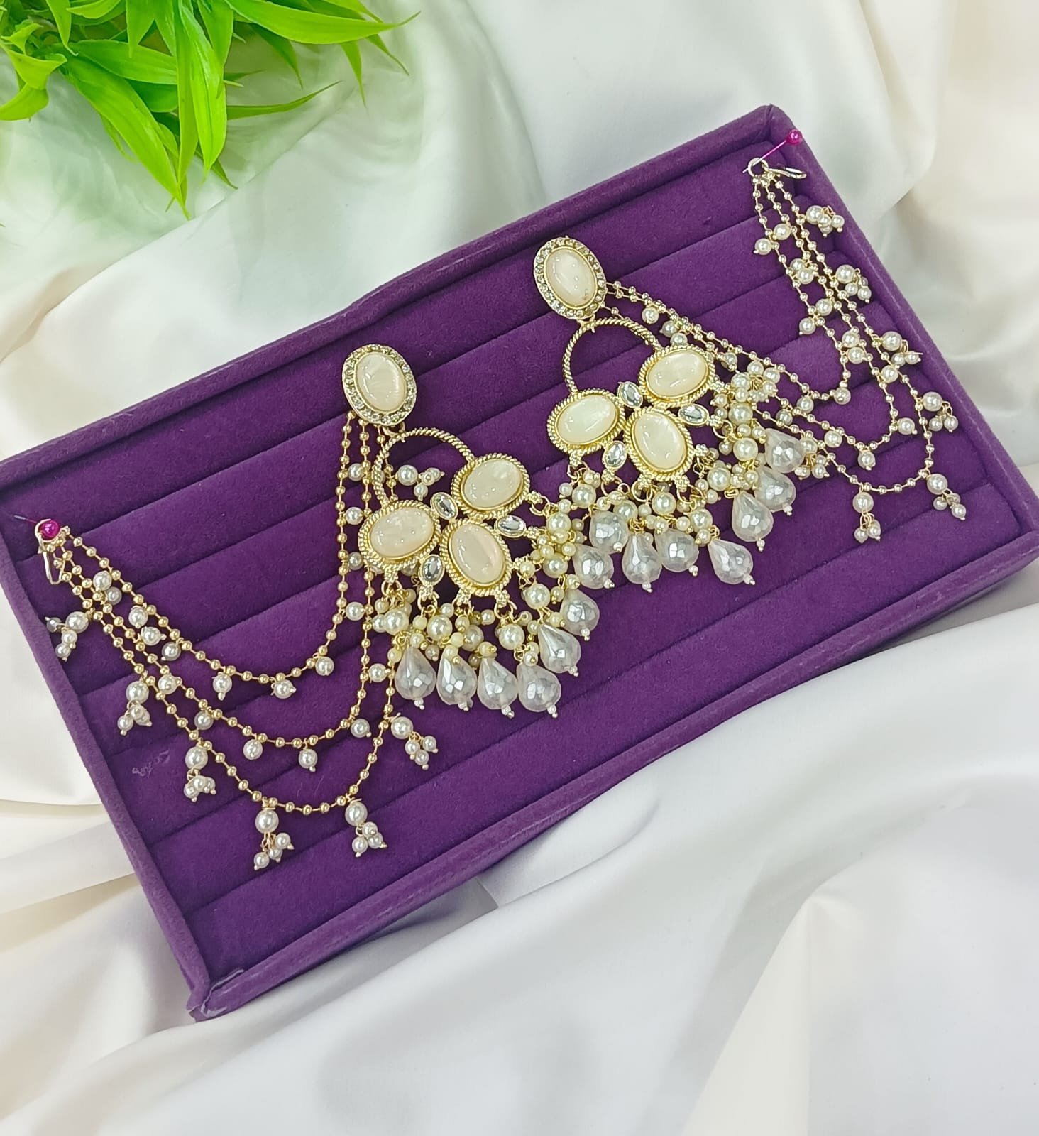 একটি স্নিগ্ধ এবং রাজকীয় লুকের জন্য বেছে নিন এই চমৎকার হোয়াইট ওভাল স্টোন বাহুবলী ইয়াররিংস। এর অফ-হোয়াইট ওভাল পাথর, ঝকঝকে ক্রিস্টাল বর্ডার এবং মাল্টি-লেয়ার মুক্তোর চেইন (Sahare) আপনার সাজে এক আভিজাত্যপূর্ণ মাত্রা যোগ করবে। বিয়ে বা যেকোনো বড় উৎসবের জন্য এটি একটি মাস্টারপিস কালেকশন।