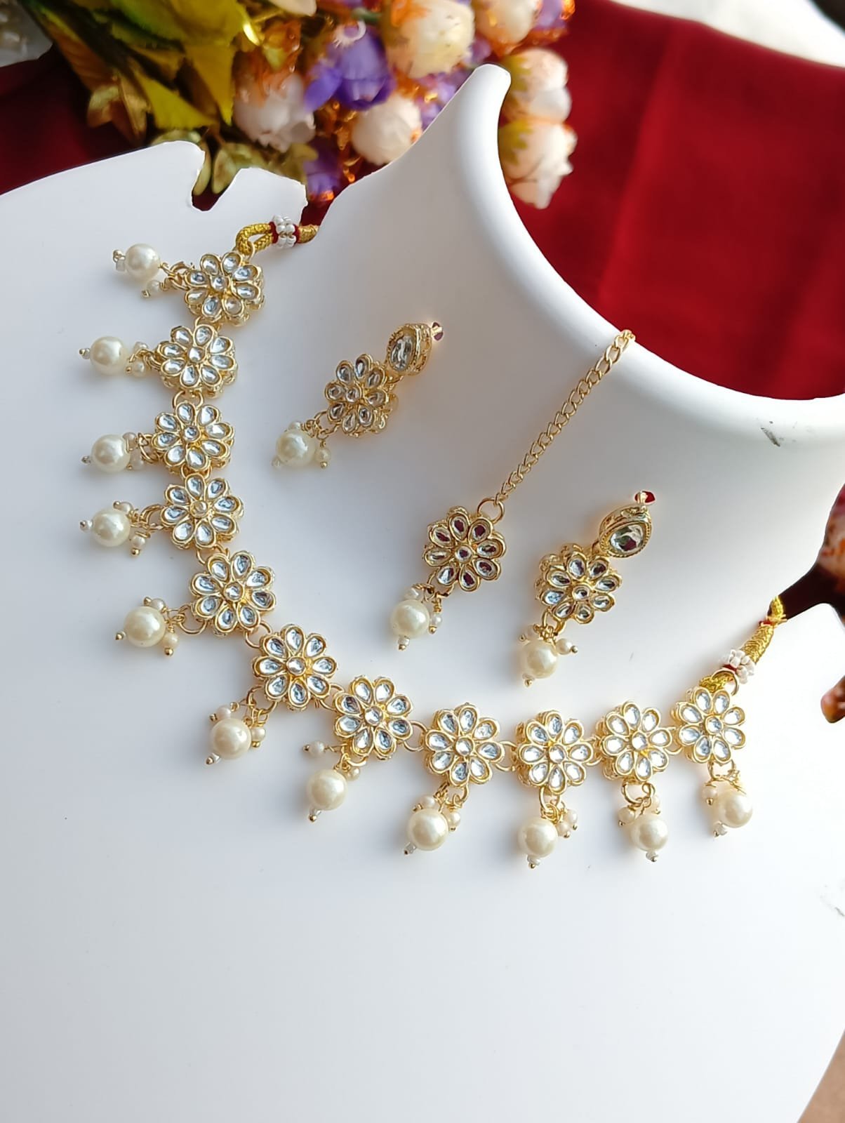 Short Description: Elegant gold-plated choker necklace featuring interconnected flower-shaped kundan/polki motifs with clear stones and dangling small white pearl drops for a delicate cascading effect. Includes matching floral drop earrings and a small maang tikka with pearl accents. A classic and graceful design, perfect for bridal wear, weddings, receptions, or traditional ethnic looks.