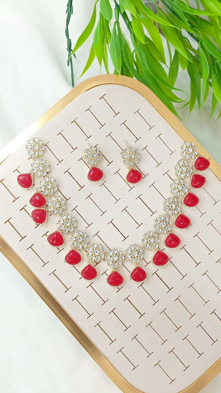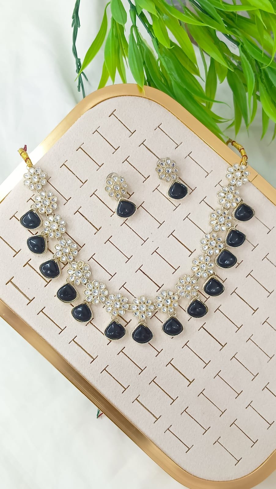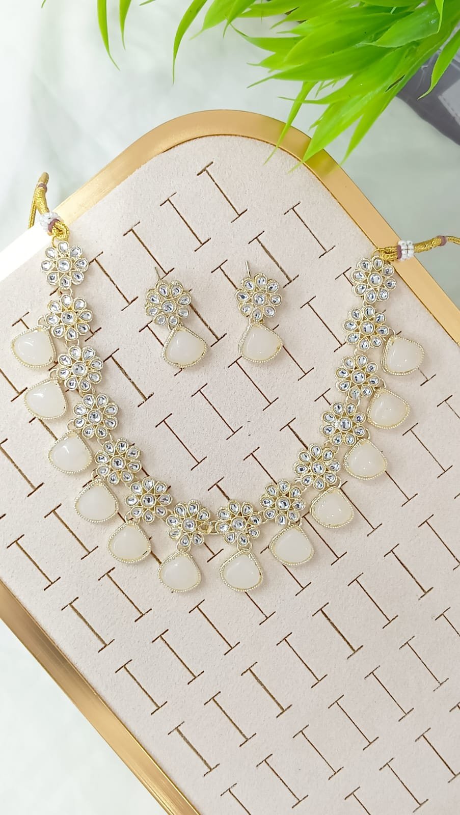 Short Description: Delicate gold-plated necklace featuring alternating floral kundan/polki motifs with clear stones and dangling mint green teardrop stones. Paired with matching drop earrings and small floral stud tops in mint green and kundan accents. A fresh, pastel design that offers a soft and elegant look—ideal for weddings, receptions, or light ethnic outfits.