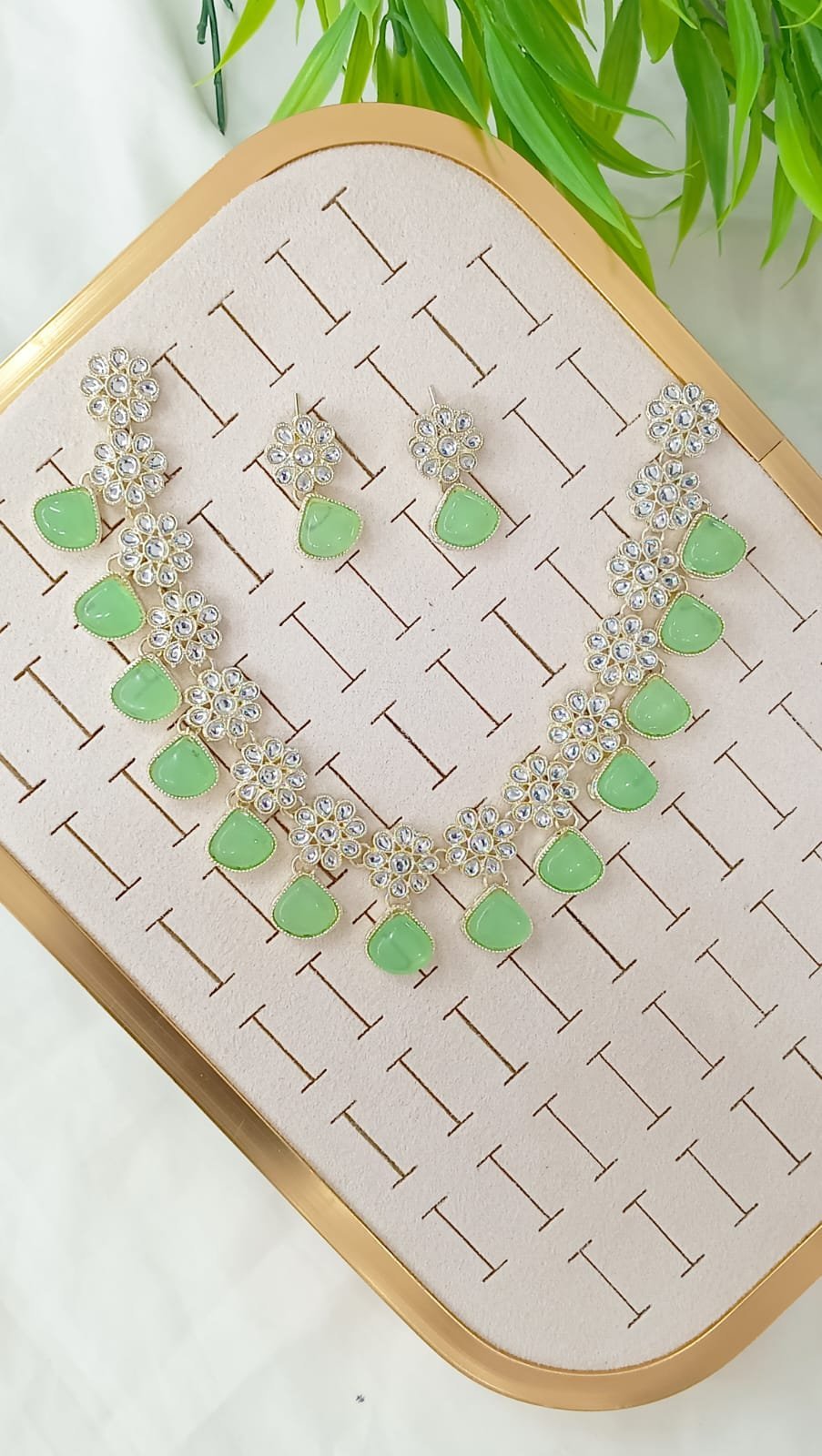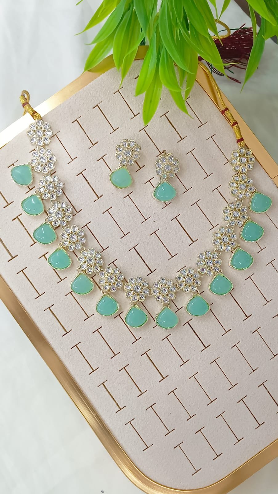 Title: Mint Green Kundan Necklace Set with Floral Drops