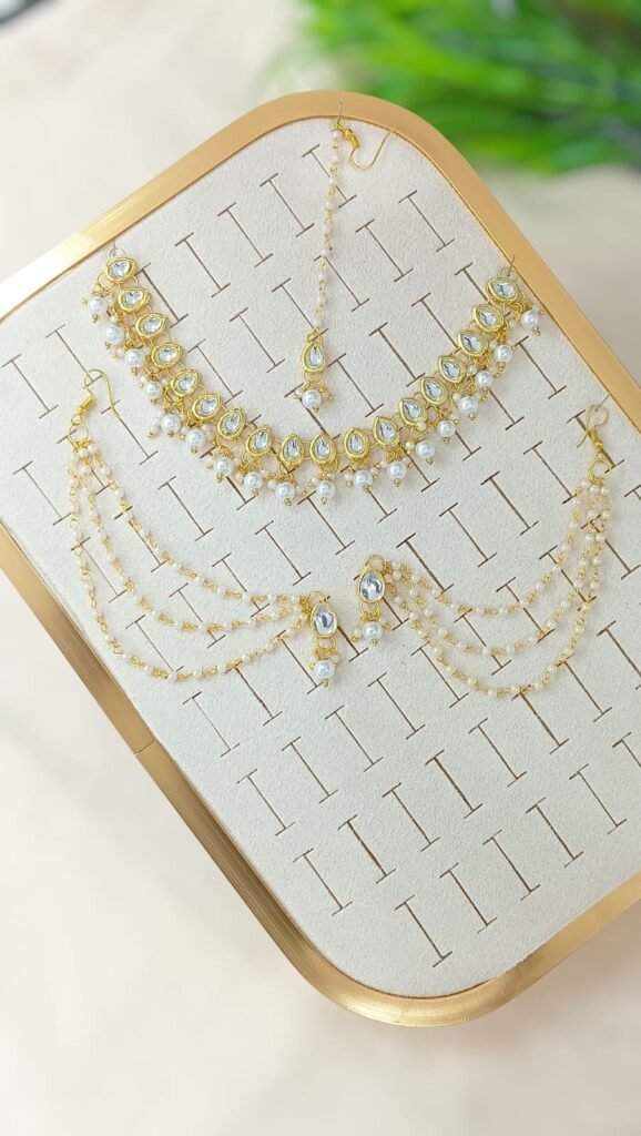 Short Description: Luxurious three-layer gold-plated necklace featuring uncut kundan/polki stones with reflective mirror backs and clusters of dangling white pearls for a rich, cascading effect. Includes a matching delicate maang tikka with pearl drops. A classic and opulent bridal design, perfect for weddings, receptions, or traditional ethnic occasions.