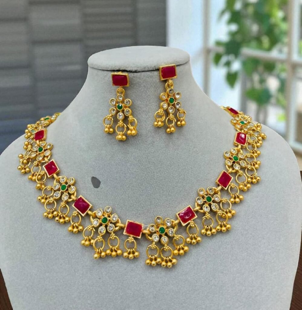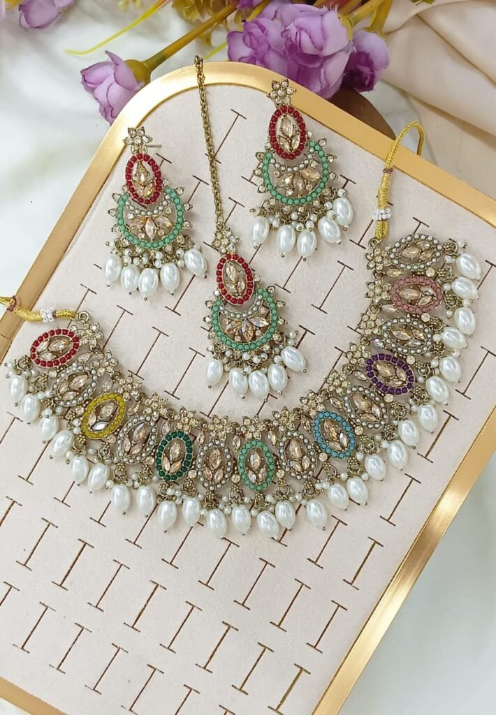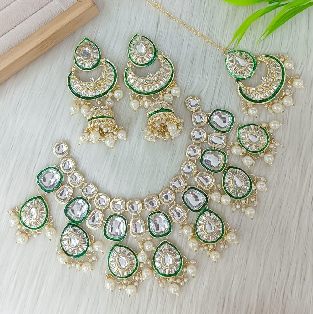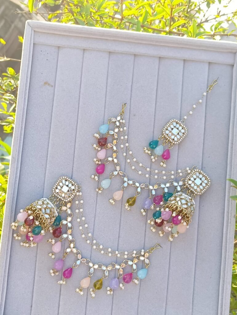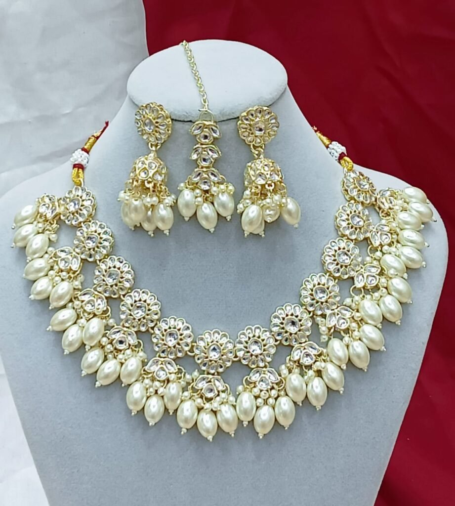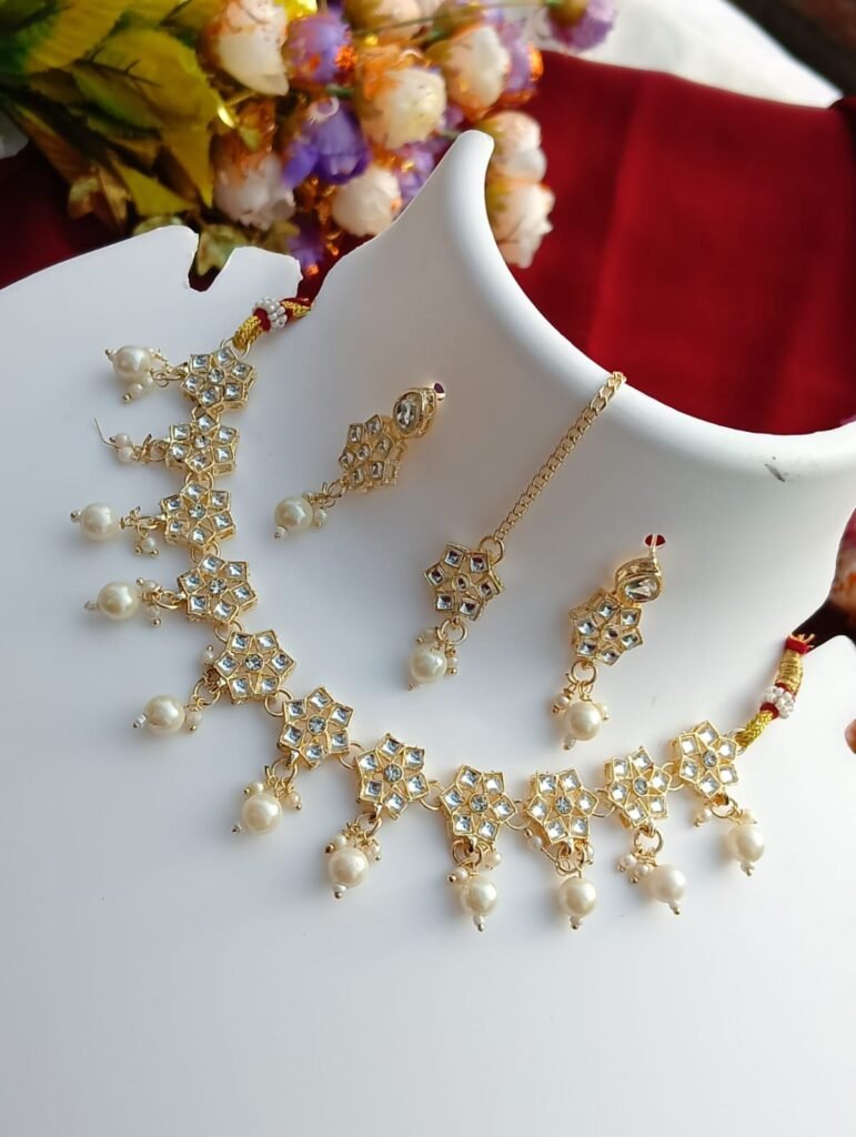 Title: Multi-Layer Mirror Kundan Pearl Necklace Set with Maang Tikka