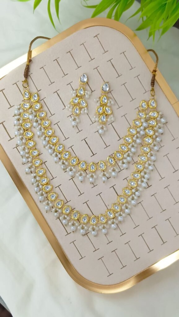 Short Description: Elegant four-strand pearl long necklace featuring a stunning central gold pendant with intricate peacock motifs, ruby red and emerald green stone accents, and sparkling American diamonds (AD). Paired with matching jhumka earrings topped with emerald and ruby details and pearl drops. A classic South Indian temple jewelry-inspired set, ideal for weddings, receptions, or traditional occasions.