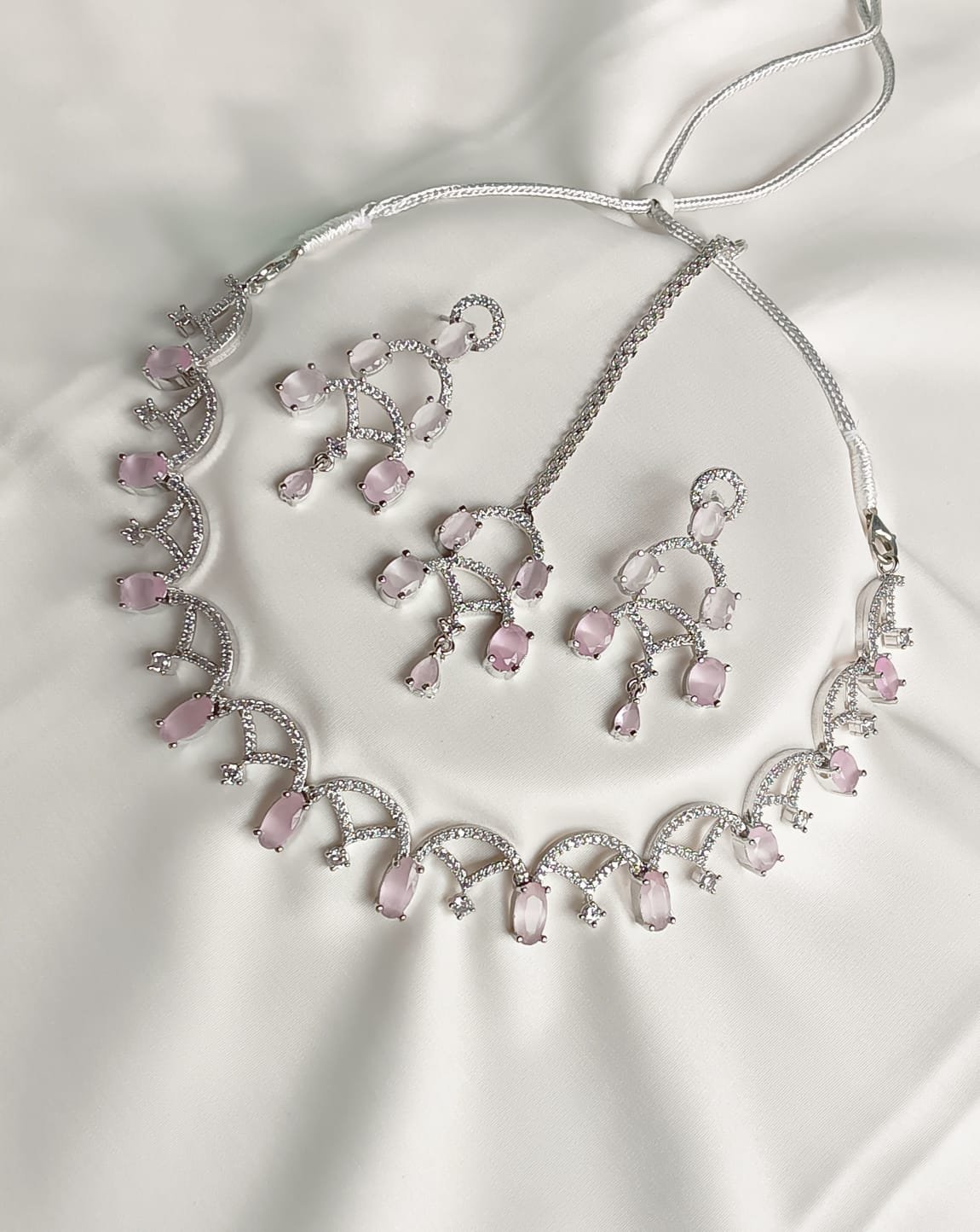 Product Name: Pastel Pink Crystal Silver-Plated Bridal Necklace Set