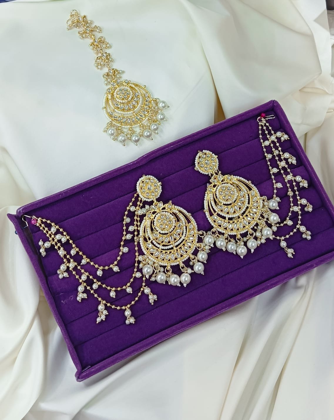 ঐতিহ্যবাহী আভিজাত্য এবং রাজকীয় সাজের এক অপূর্ব সংমিশ্রণ এই কুন্দন চাঁদবালি সেটটি। গোল্ডেন ফিনিশের ওপর ঝকঝকে কুন্দন পাথর এবং সাদা মুক্তোর নিখুঁত কাজ আপনাকে যেকোনো বিশেষ অনুষ্ঠানে দেবে এক অনবদ্য ব্রাইডাল বা মেহমানি লুক। এর সাথে থাকা তিন স্তরের মুক্তোর চেইন (Sahare) আপনার সাজকে করবে আরও আকর্ষণীয়।